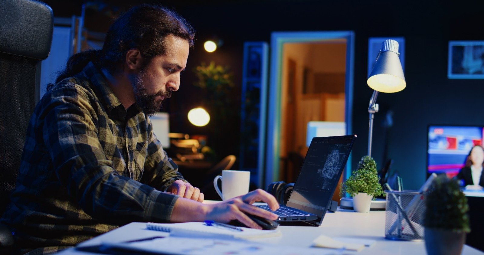 “Replace the background with a modern studio setup and enhance lighting.”